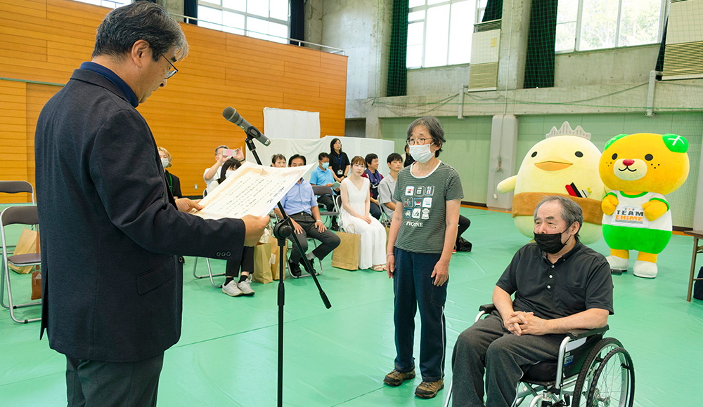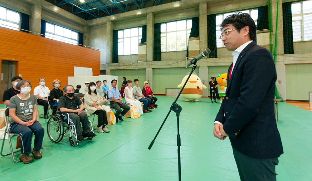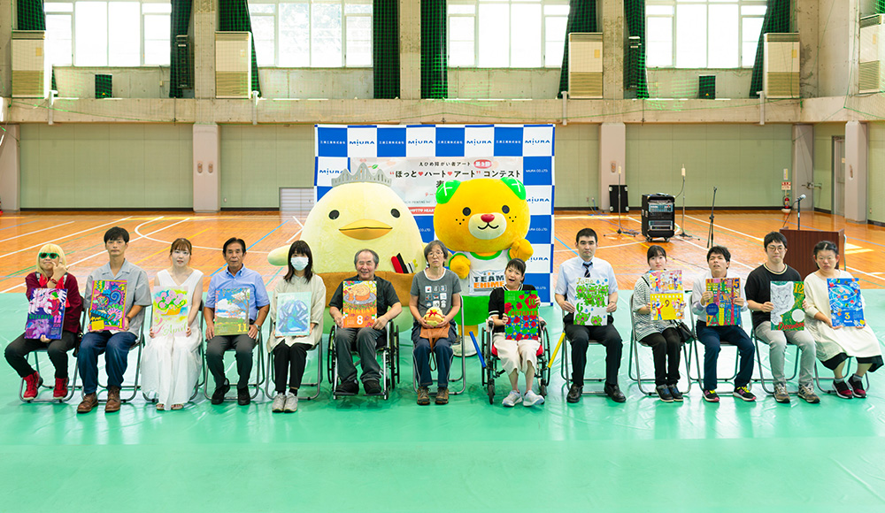 2025年8月29日(金)ミウラート・ヴィレッジ(三浦美術館)にて第3回 ‟ほっと♡ハート♡アート“コンテストの受賞者13名の表彰式を行いました。この度、受賞されました皆様、誠におめでとうございます。今回は、夏の開催のため熱中症対策として体育館にて行いました。体調不良者も出ることなく、受賞者の皆様の喜び溢れる姿を見ることができ、事務局一同も大変うれしく思います。今回も、バリィさんとみきゃんがお祝いにかけつけてくれました。