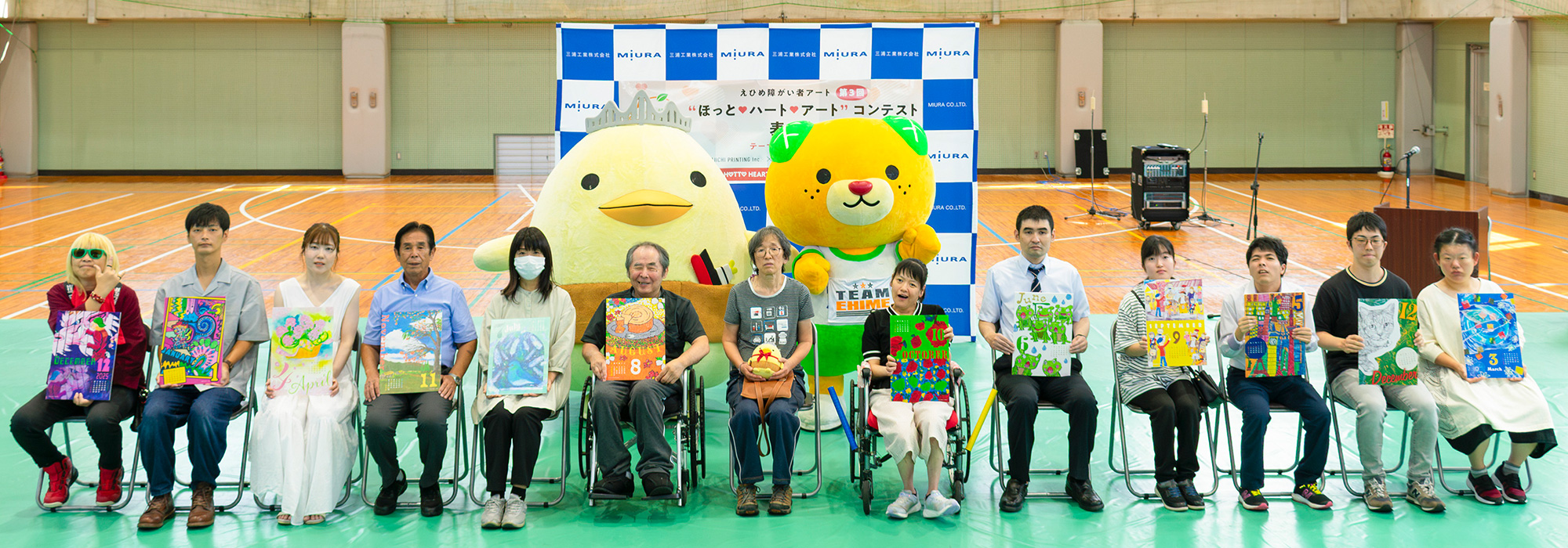 2025年8月29日(金)ミウラート・ヴィレッジ(三浦美術館)にて第3回 ‟ほっと♡ハート♡アート“コンテストの受賞者13名の表彰式を行いました。この度、受賞されました皆様、誠におめでとうございます。今回は、夏の開催のため熱中症対策として体育館にて行いました。体調不良者も出ることなく、受賞者の皆様の喜び溢れる姿を見ることができ、事務局一同も大変うれしく思います。今回も、バリィさんとみきゃんがお祝いにかけつけてくれました。