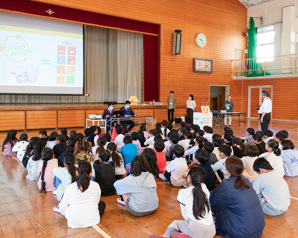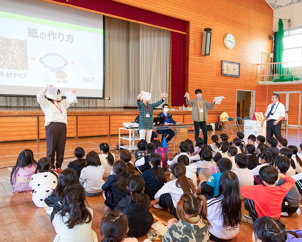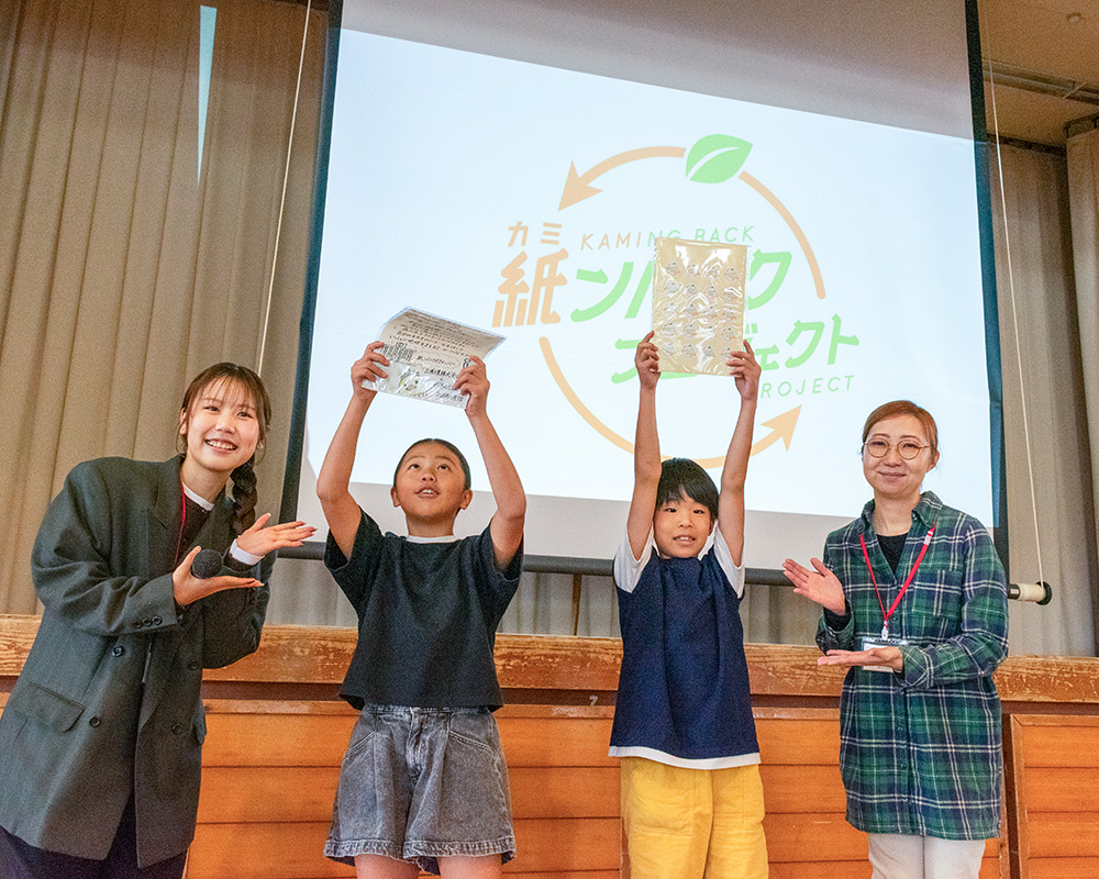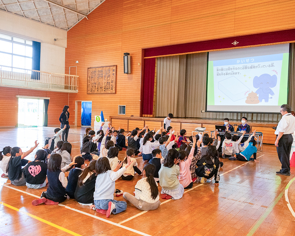 「紙ンバックプロジェクト」出前授業とは、子どもたちに紙のリサイクル体験を通じて環境への理解を深めてもらう取り組みです。子どもたちが集めた古紙をアップサイクルし、ノートとして学校へ寄贈し活用してもらいます。この活動は2022年から県内の学校で実施しており、堀江小学校で5校目となります。